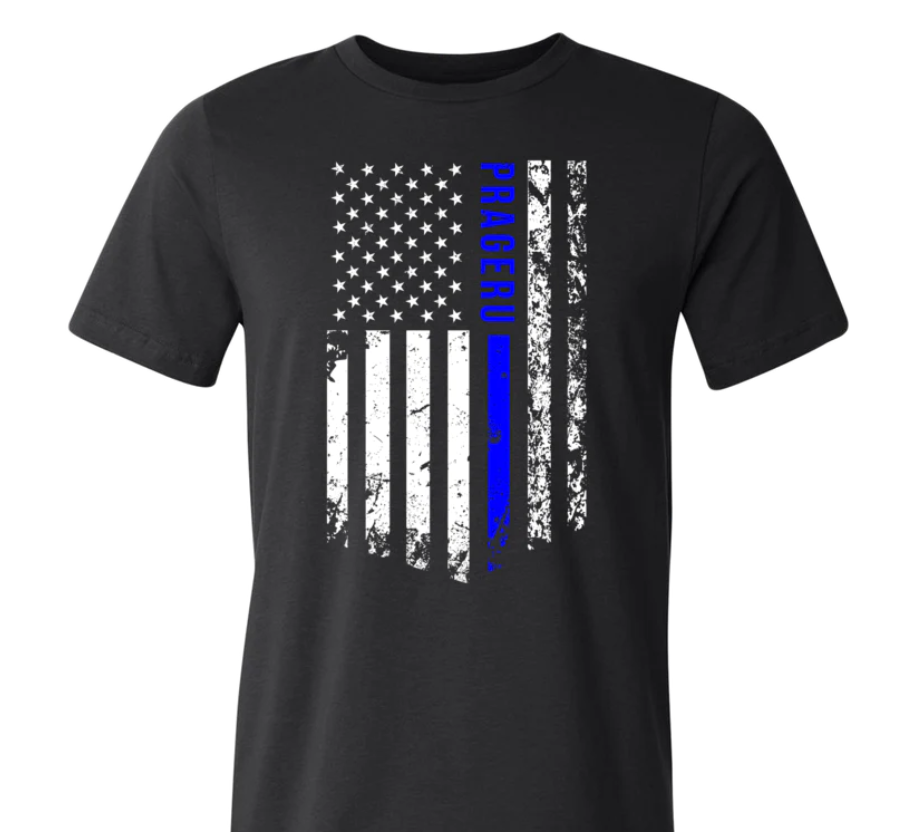 Show your support with this PragerU “Thin Blue Line” Distressed Flag T-shirt – Unisex.